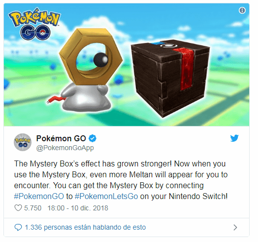 Thus, if you want to have Meltan in Pokémon GO or Pokémon Let’s Go Pikachu / Eevee, the process remains intact: the first thing you must do is open the Mystery Box in the application and go out to the street to walk. During the next thirty minutes will appear – now more often – wild Meltan that we can capture using our Poké Ball. Once the 30 minutes are over, we will have to wait seven calendar days until we use the item again.Ver imagen en Twitter